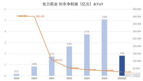 佐力药业的业绩增速竟不逊于全盛时期的片仔癀。其扣非净利润近5年GAGR高达97.98%,2024年同比增速为35.89%,2025年Q1同比增速为26.16%。并且公司的股权激励所制定的业绩目标,要求2025年—2027年业绩每年增长30%以上。